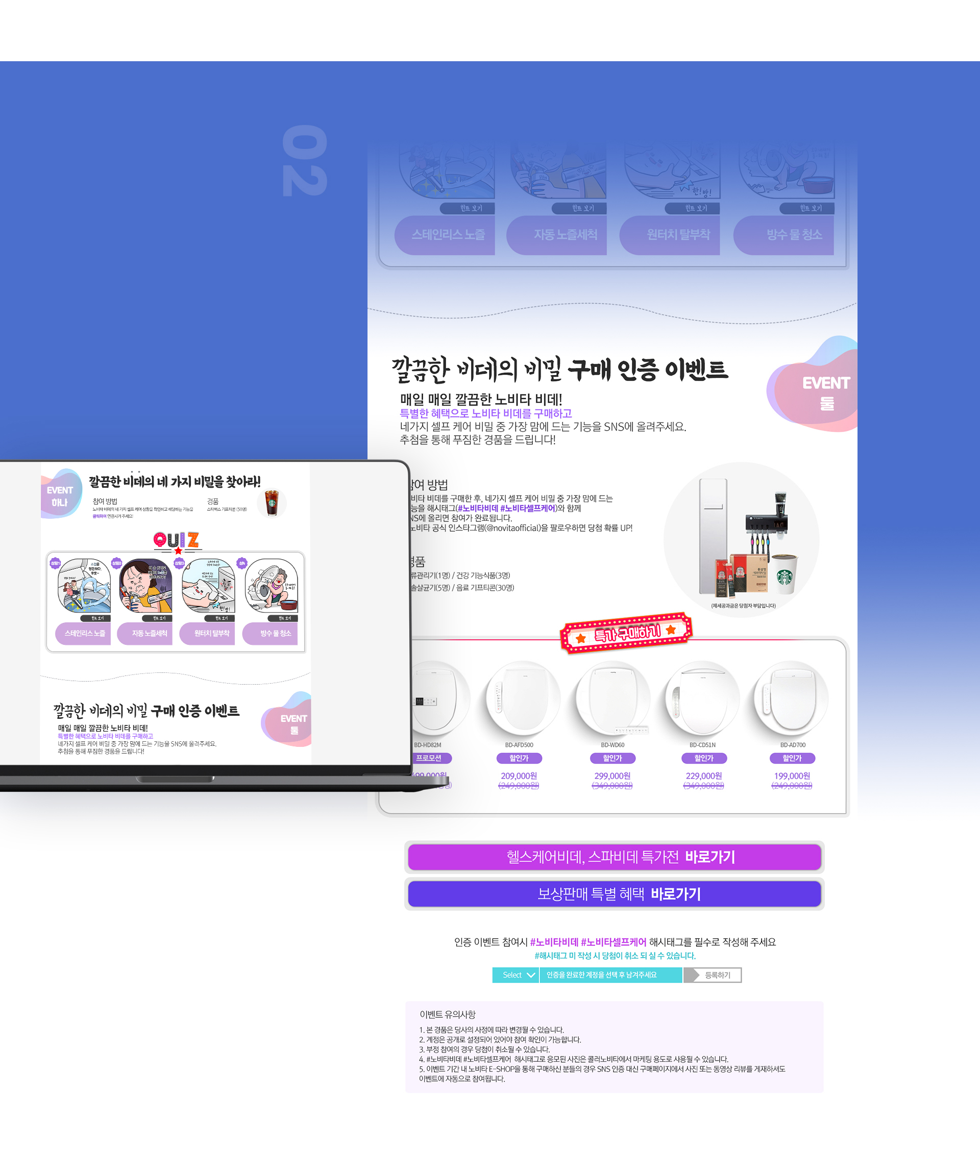 특별한 혜?으로 노비타 비데를 구매하고 네가지 셀프 케어 비밀 중 가장 맘에 드는 기능을 sns에 올려주세요.