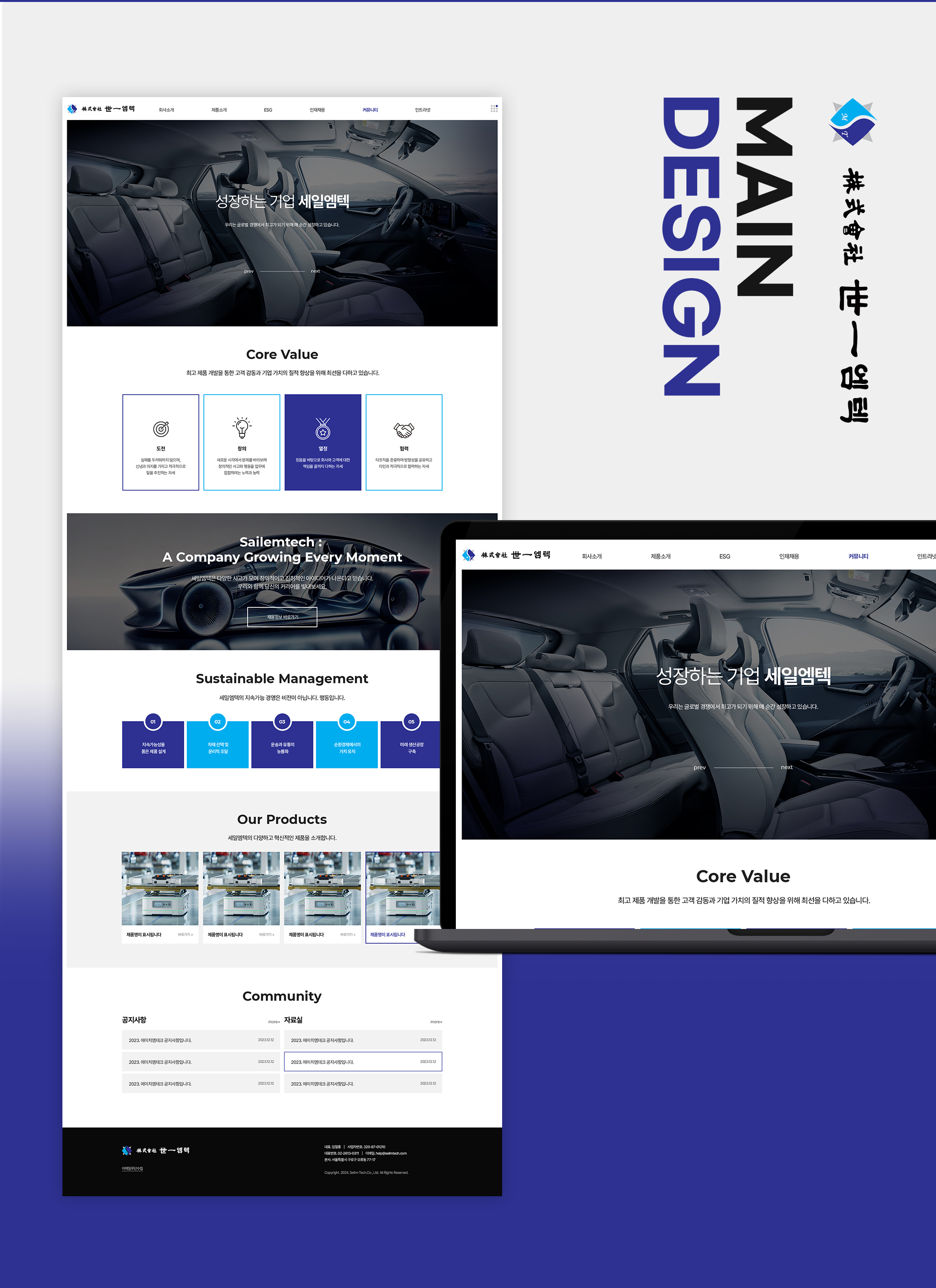 생산 제품을 메인 이미지로 활용하여 기업의 사업 내용을 비주얼로 전달