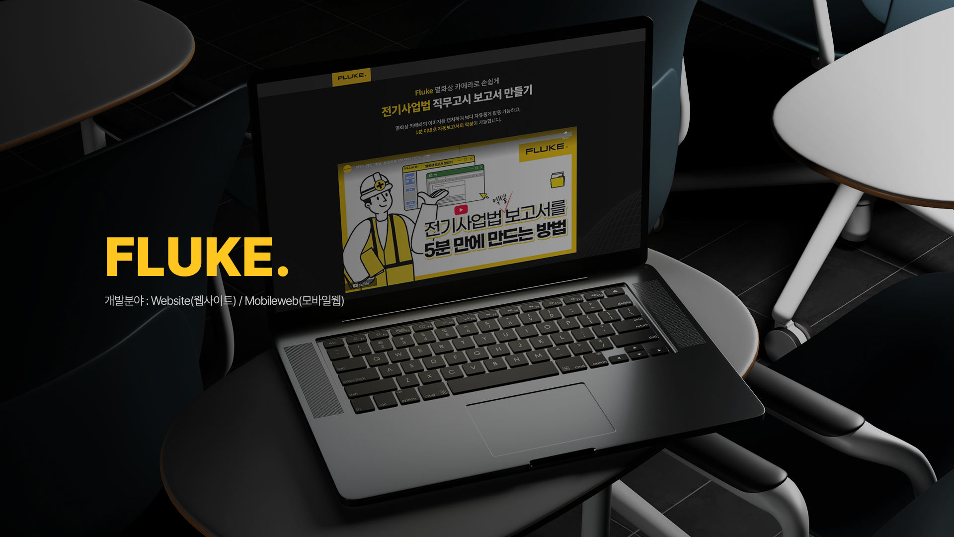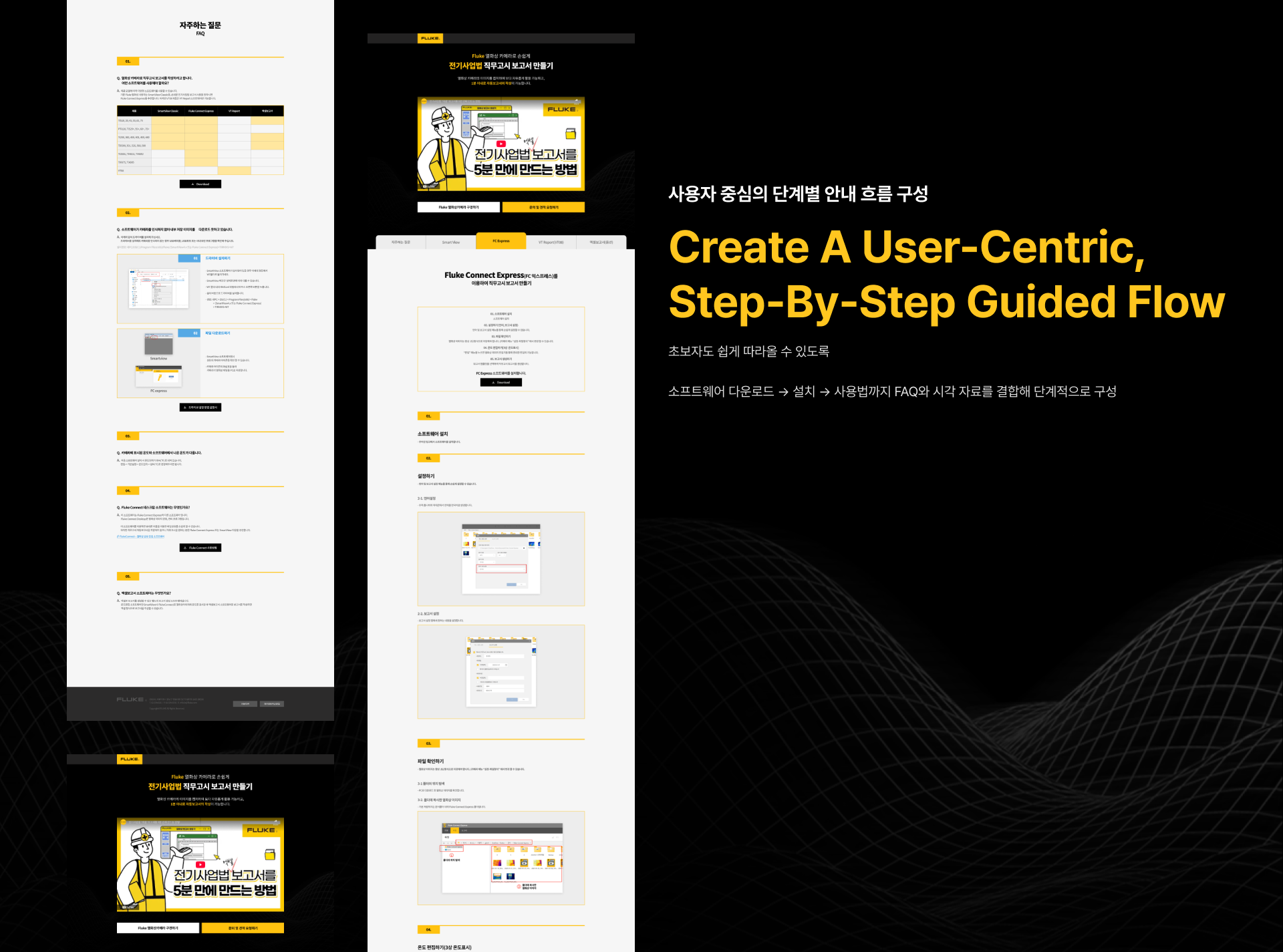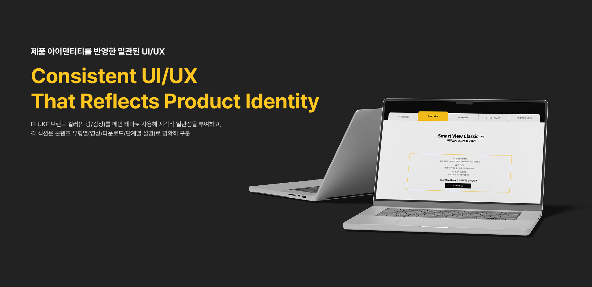 FLUKE 브랜드 컬러(노랑/검정)를 메인 테마로 사용해 시각적 일관성을 부여하고,
