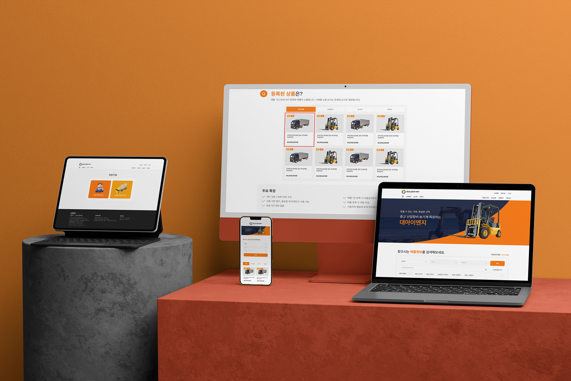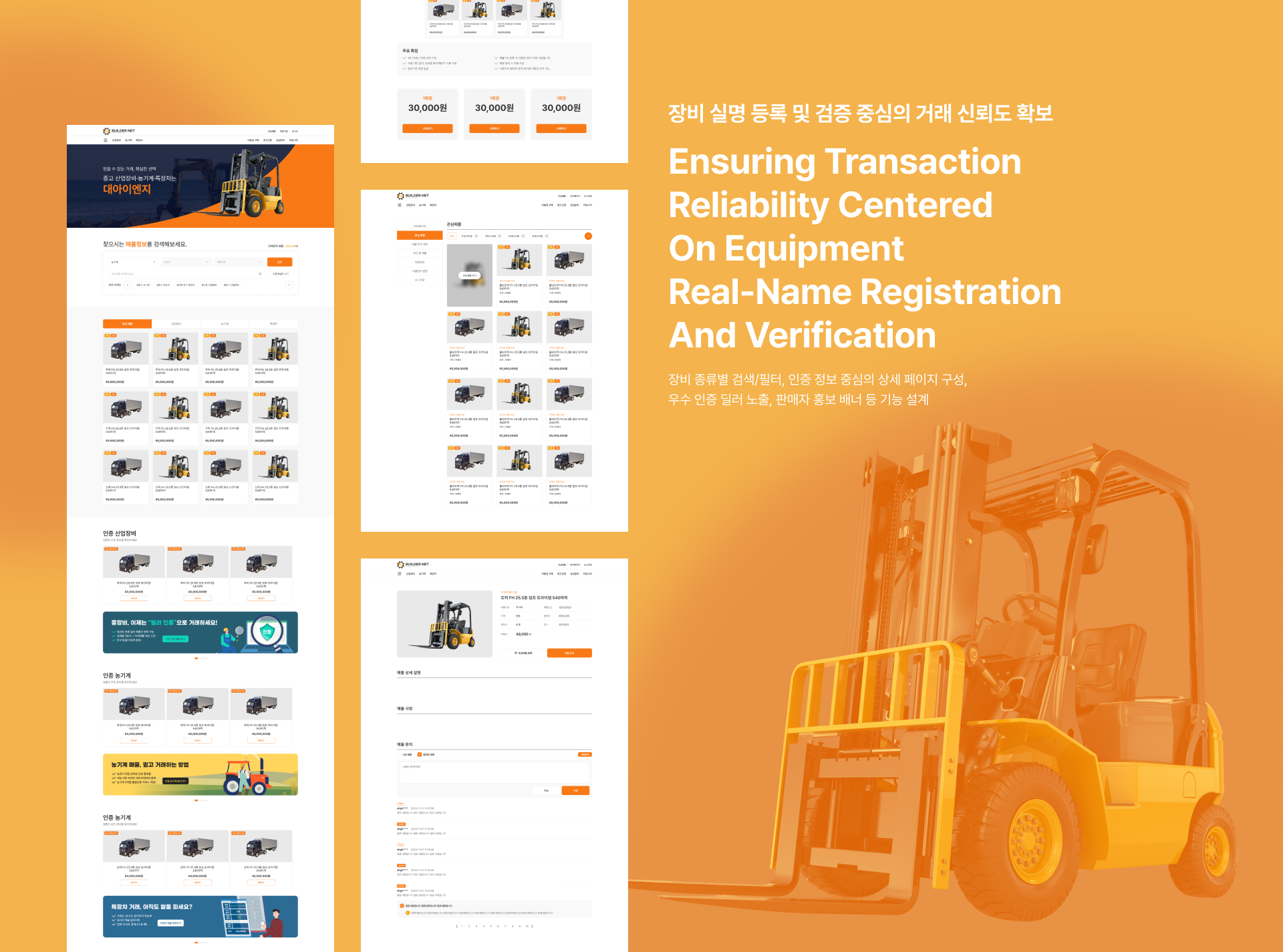 중심의 장비 등록, 홍보 배너, 앱 연동 기능을 갖춘 거래 플랫폼