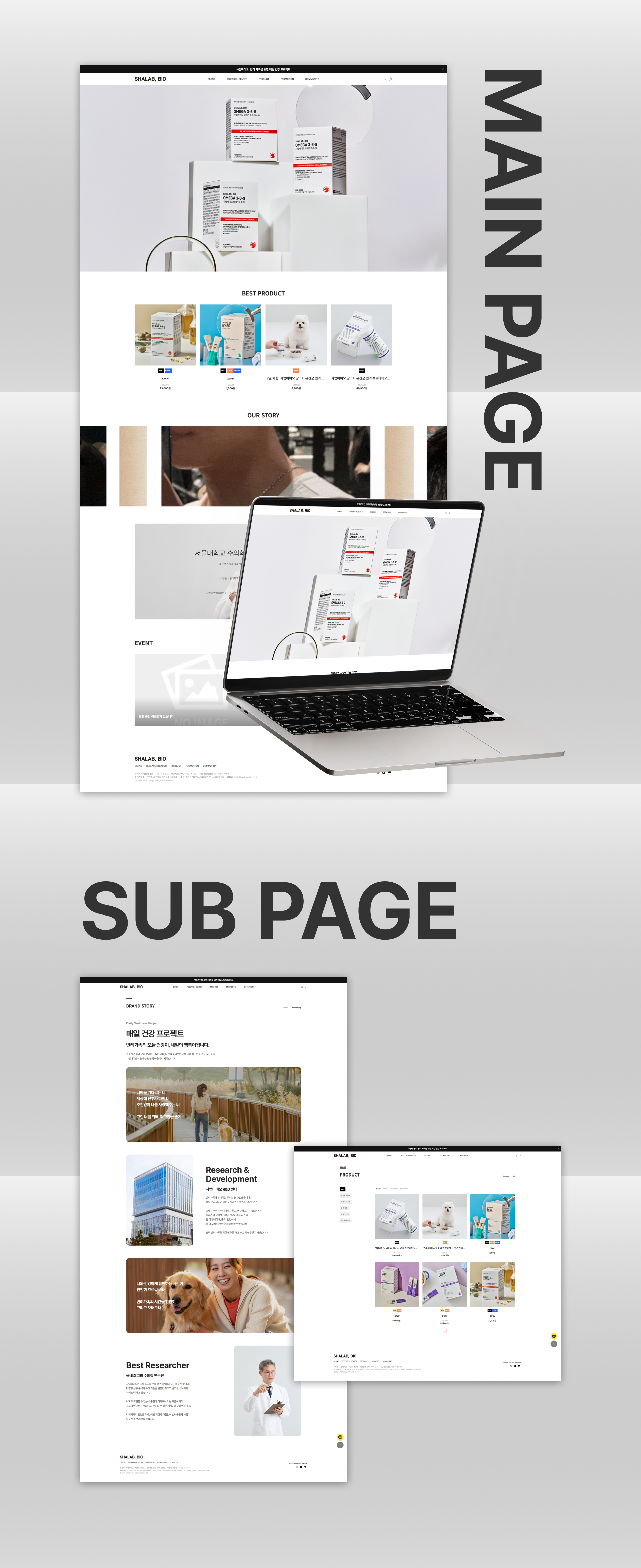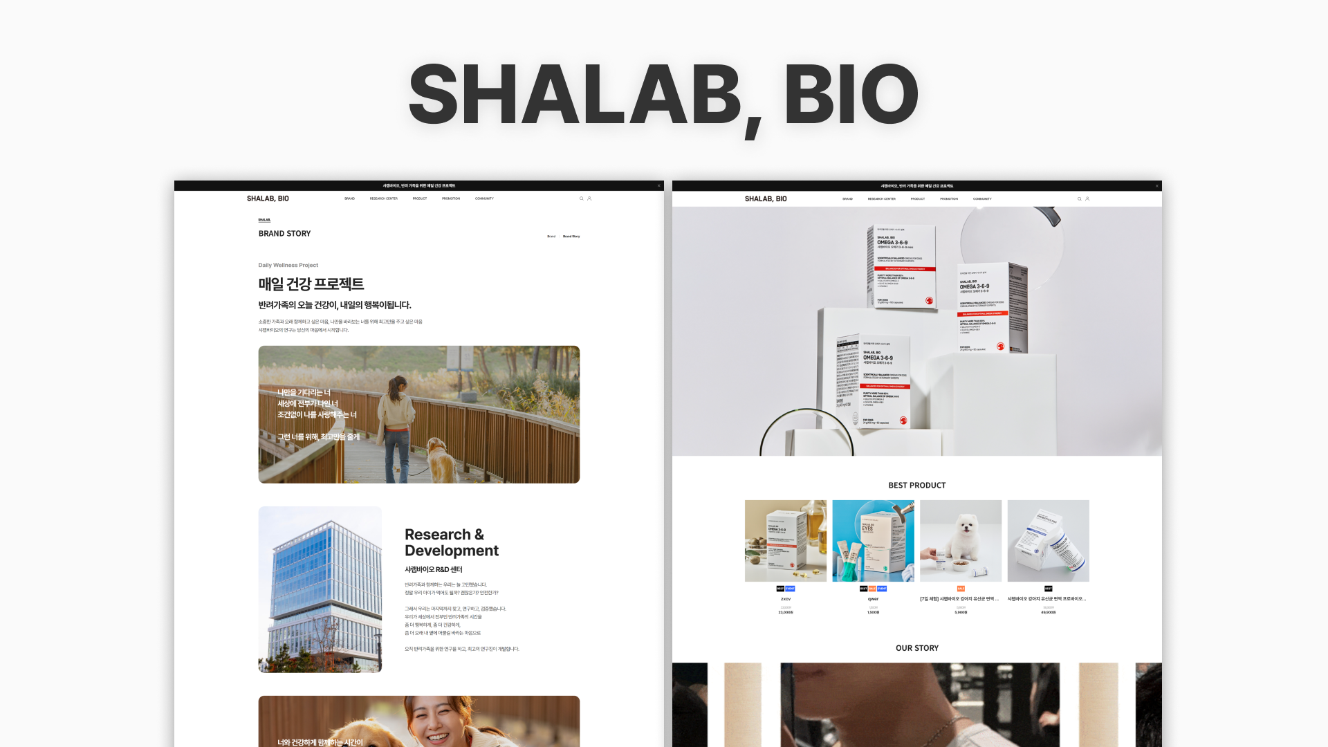 브랜드 신뢰성을 강조하는 클린한 UI와 연구·제품·커뮤니티 중심의 구조를 통해