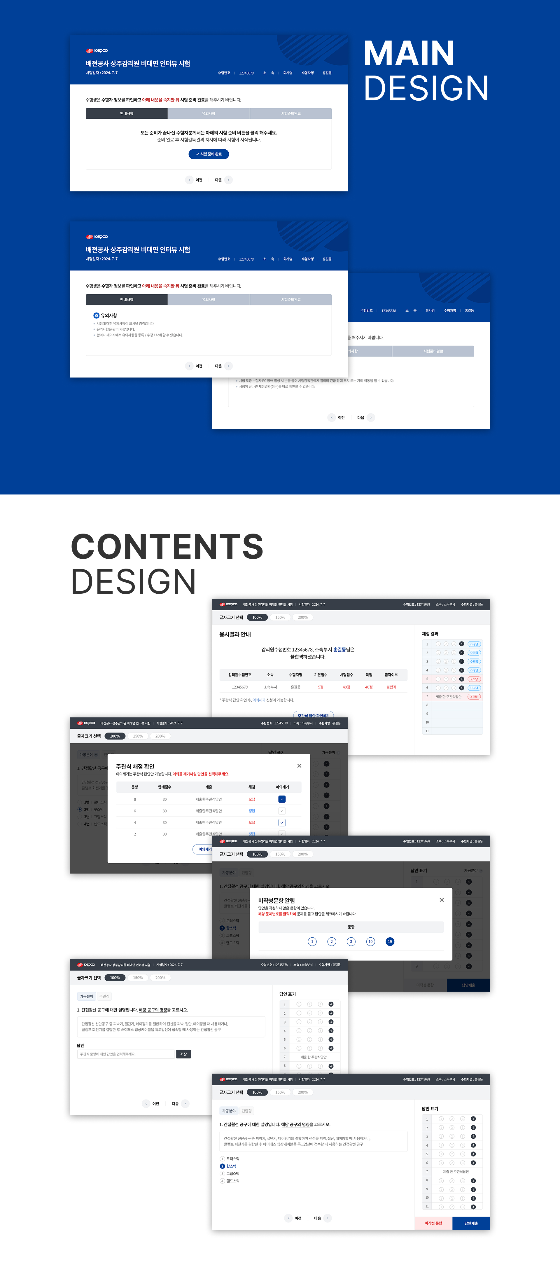 수험자 편의성과 신뢰성을 강화한 UI/UX를 설계하고, 관리자 기능을 통해 유의사항·문제풀이 안내 관리 및 주관식 채점 확인까지 지원하는 통합