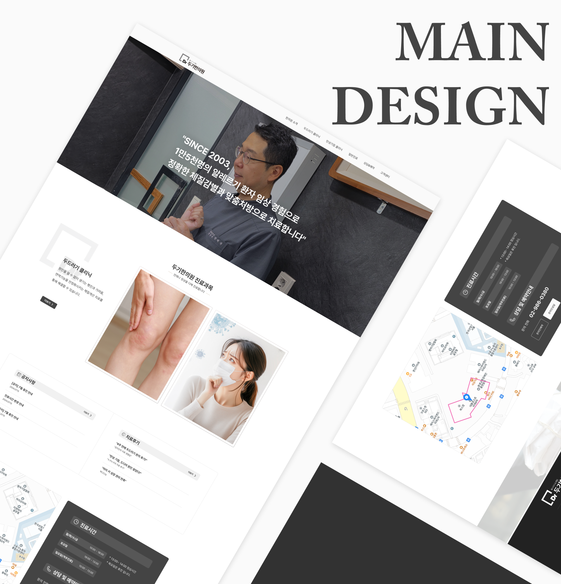 대표원장의 철학이 잘 드러나는 메인 비주얼, 진료 분야 소개, 상담 및 예약 기능까지