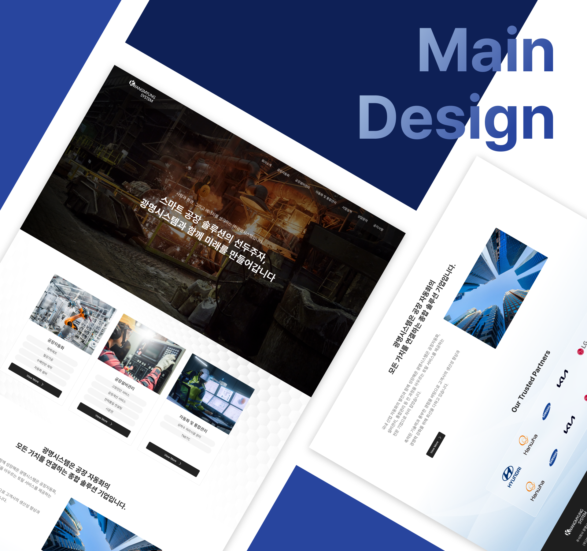 딥 블루 기반 컬러에 산업 현장 이미지와 직관적인 아이콘을 활용해 기술 중심 브랜드 톤 구현.