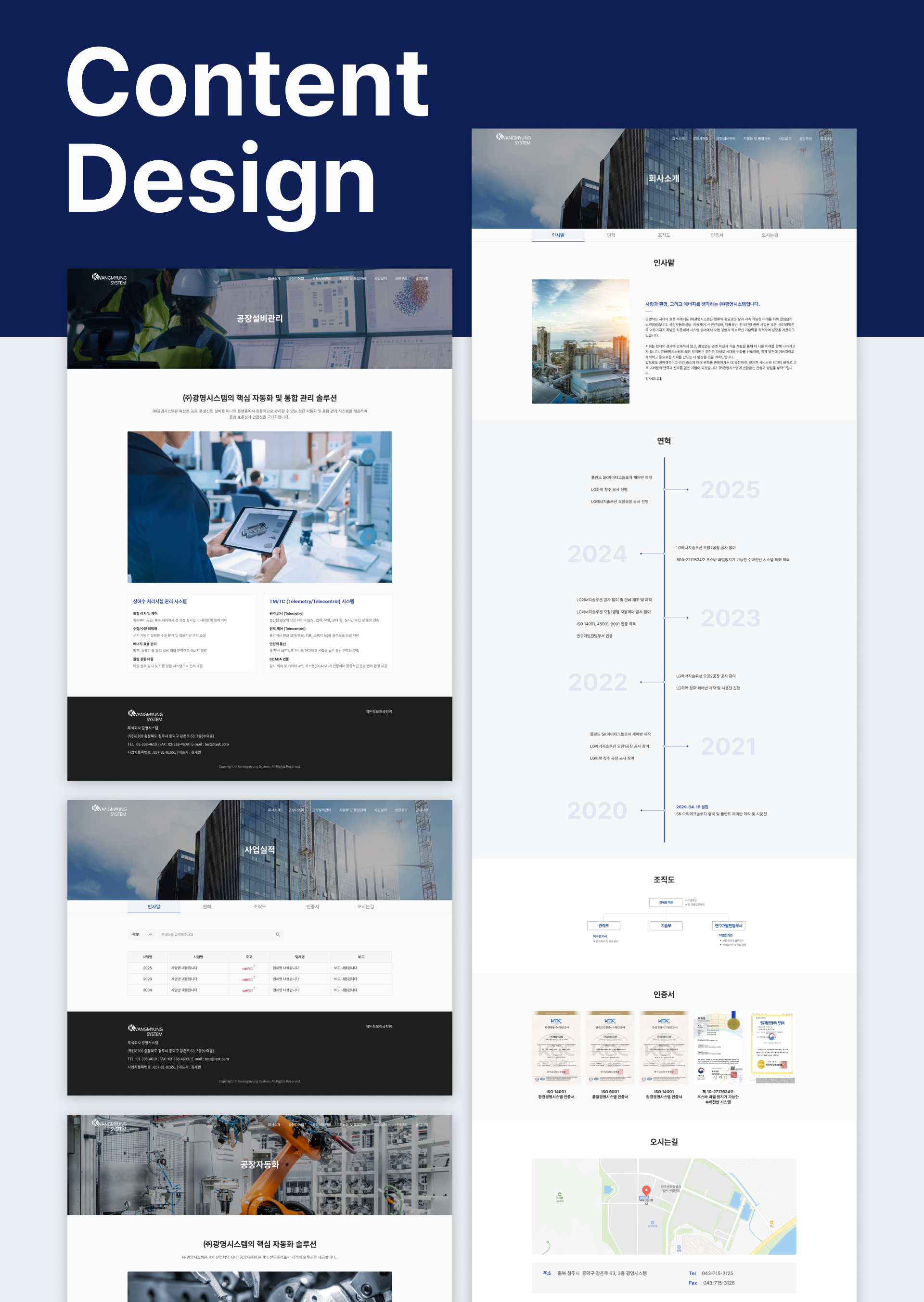 솔루션 소개, 고객사 레퍼런스, 연혁·인증서·오시는 길 등 핵심 콘텐츠를 중심으로