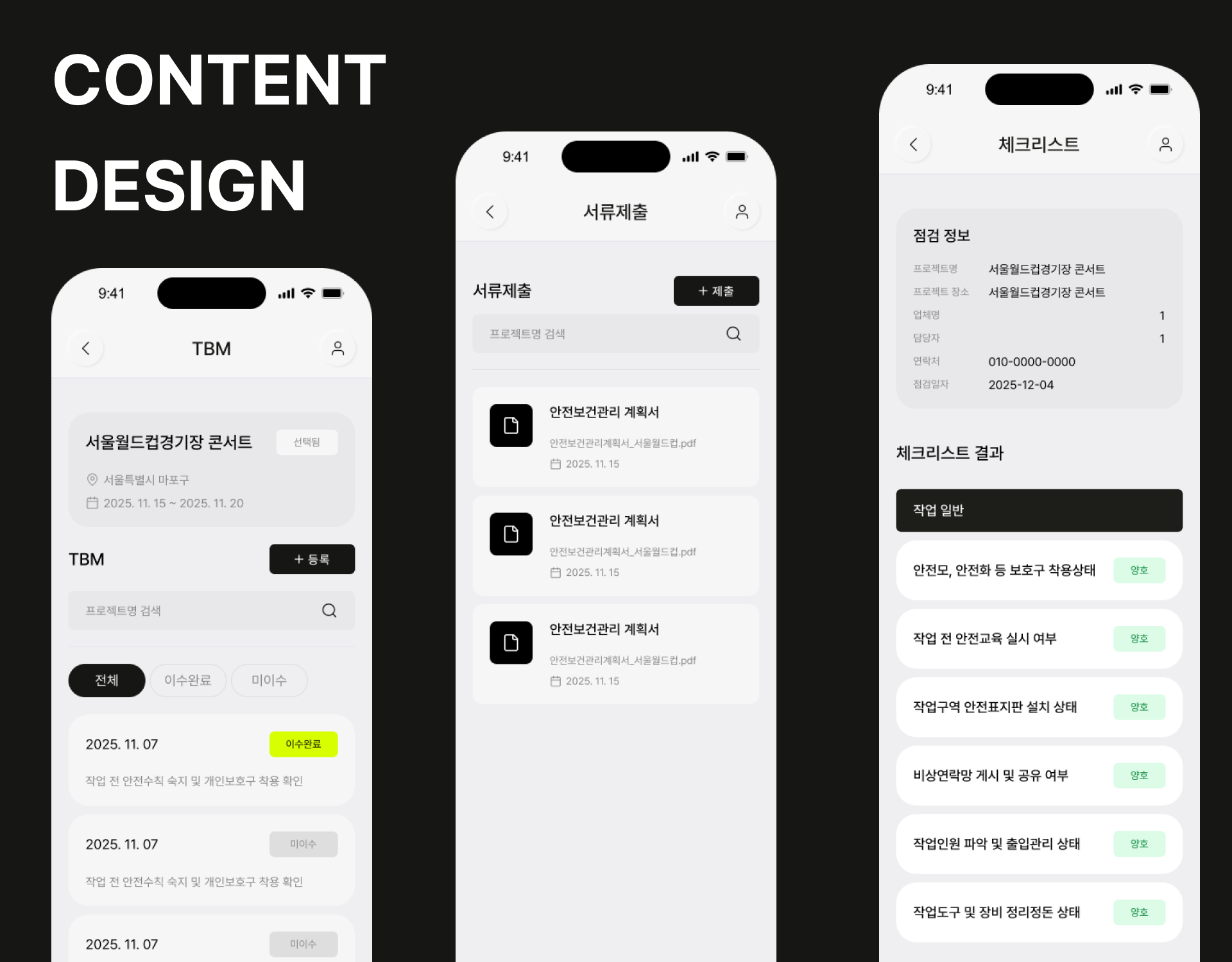 공연 안전관리 앱에 필요한 전문성·긴급성·신뢰감을 동시에 전달하는 UX를 구현했습니다.