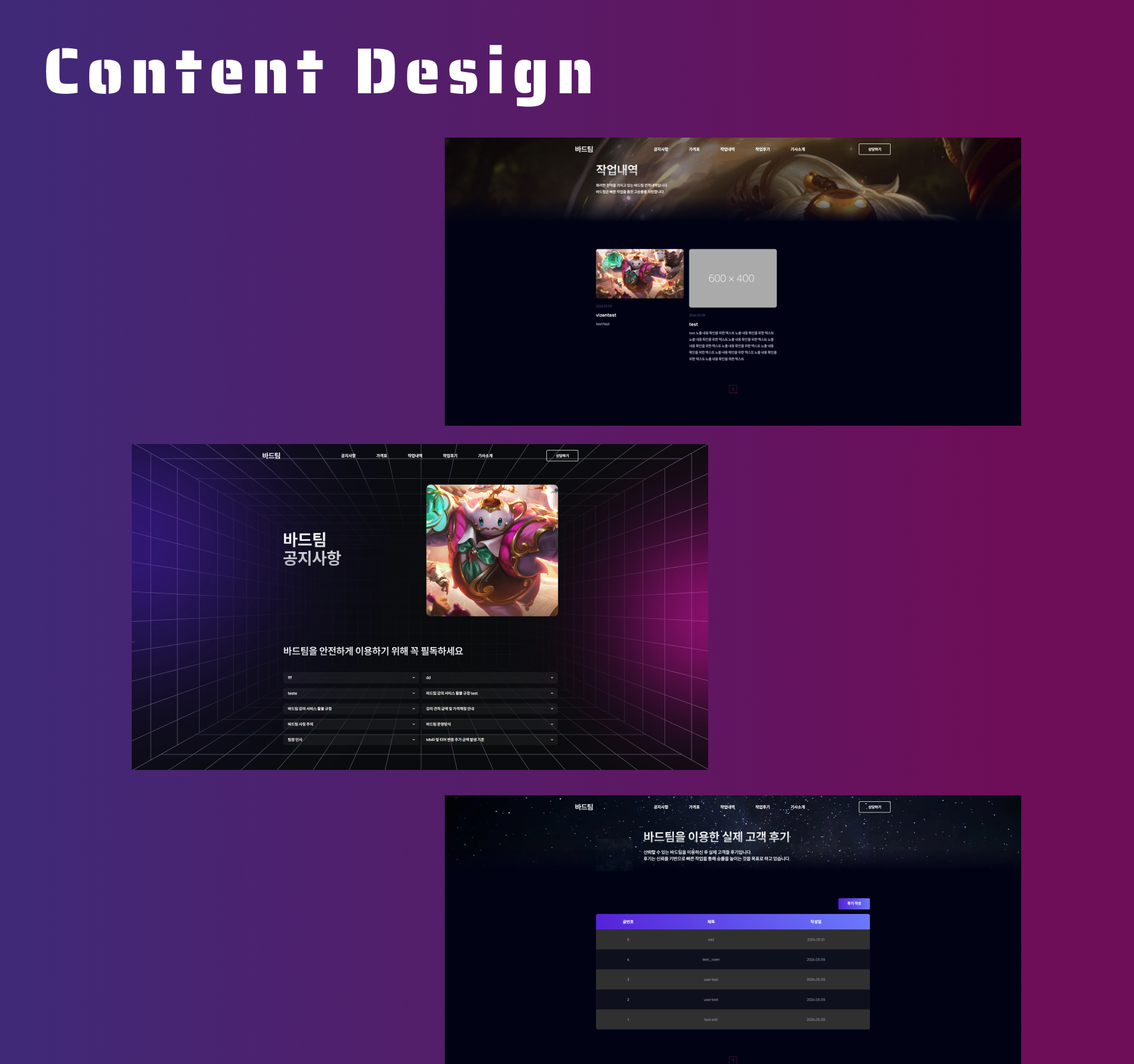 작업 안내, 공지사항, 고객 후기 영역을 명확히 구분하여